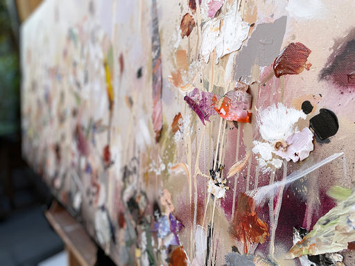 “Met verschillende lichtval op de glanzende paletstukken zie je elke keer weer andere bladeren, bloemen en kleuren in mijn werk ontstaan. Ikzelf ook! Binnen mijn eigen techniek ben ik nog steeds aan het ontdekken en experimenteren en word ik zelf verrast. Bovendien geeft het gebruik van deze verfresten mijn werk ook een duurzaam ‘tintje’. Heel fijn om zo aan het werk te zijn.”
